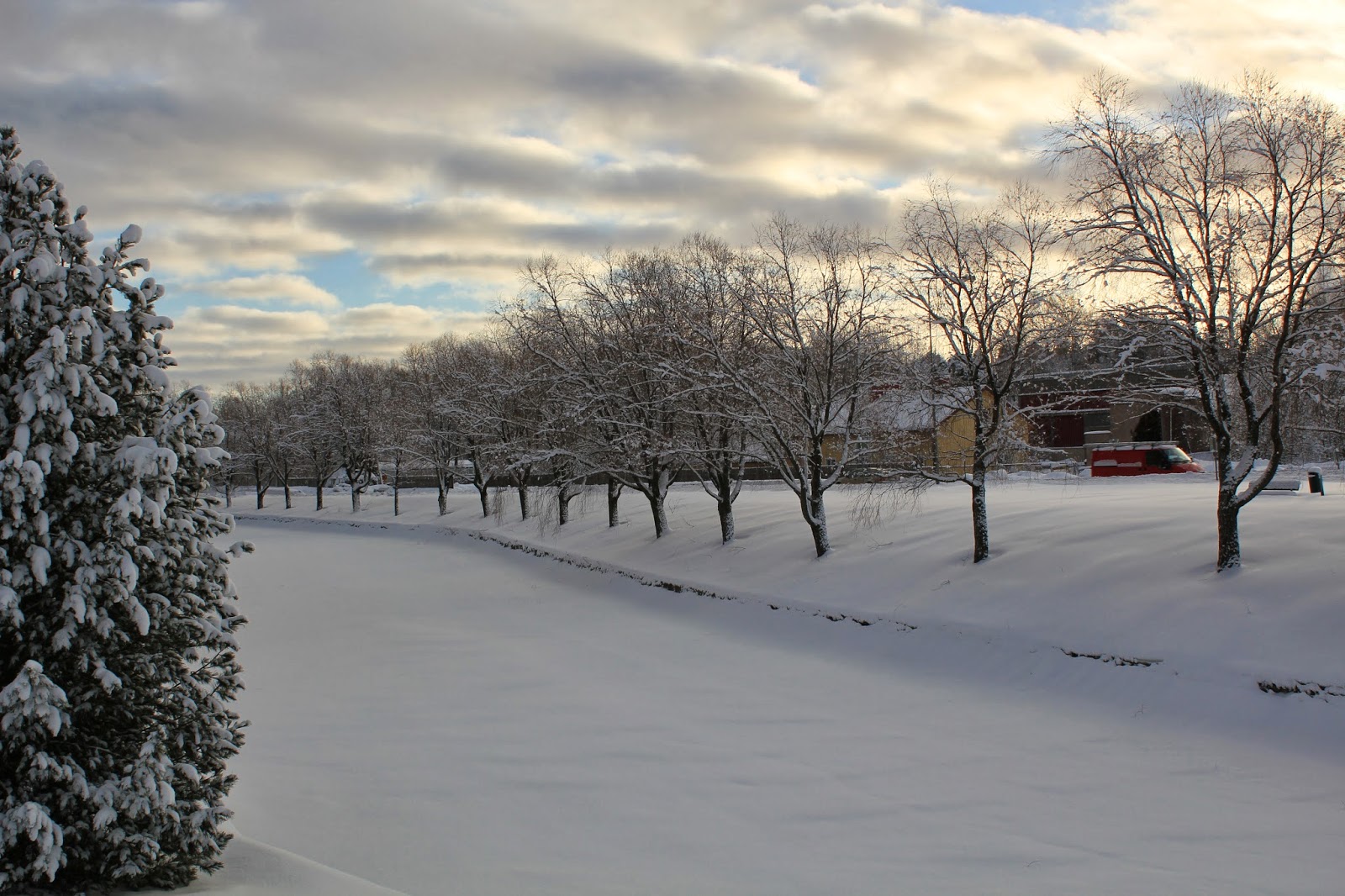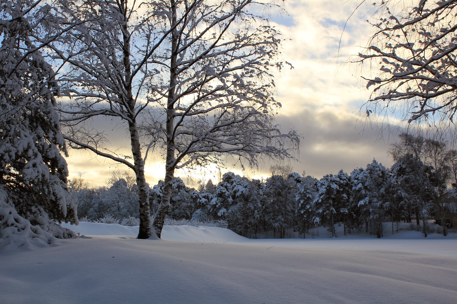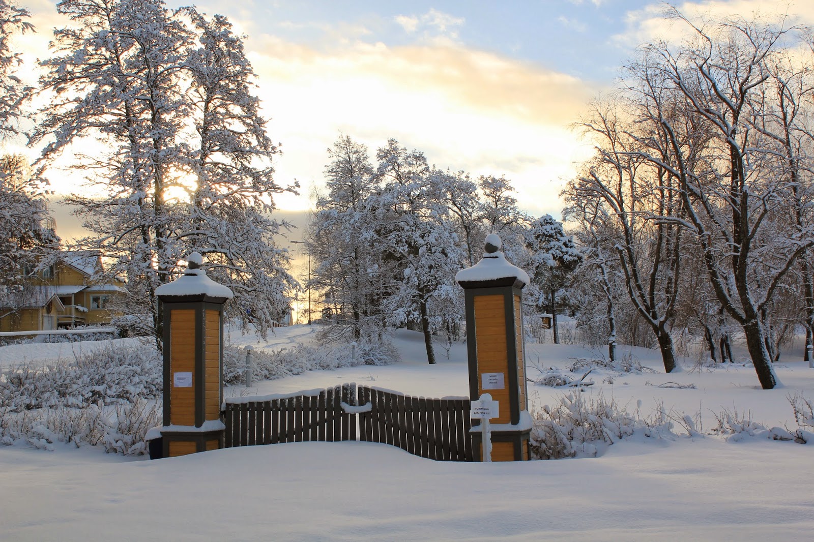 Aurinko alkaa jo laskemaan ja hämärä saapumaan. Lumi valaisee ja aurinko heijastuu monesta eri pinnasta antaen valoa.