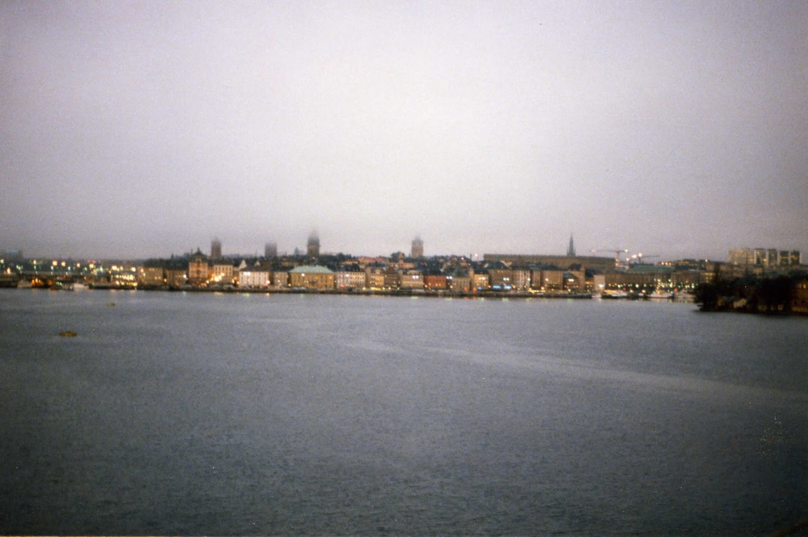 Sumuinen ilta Tukholma mereltä käsin eli kyllä Viking Linen laivan kannelta otettuna v.1980-82 ikivanhalla pokkari filmikameralla Yashica T4, joka oli valkoinen väriltään.