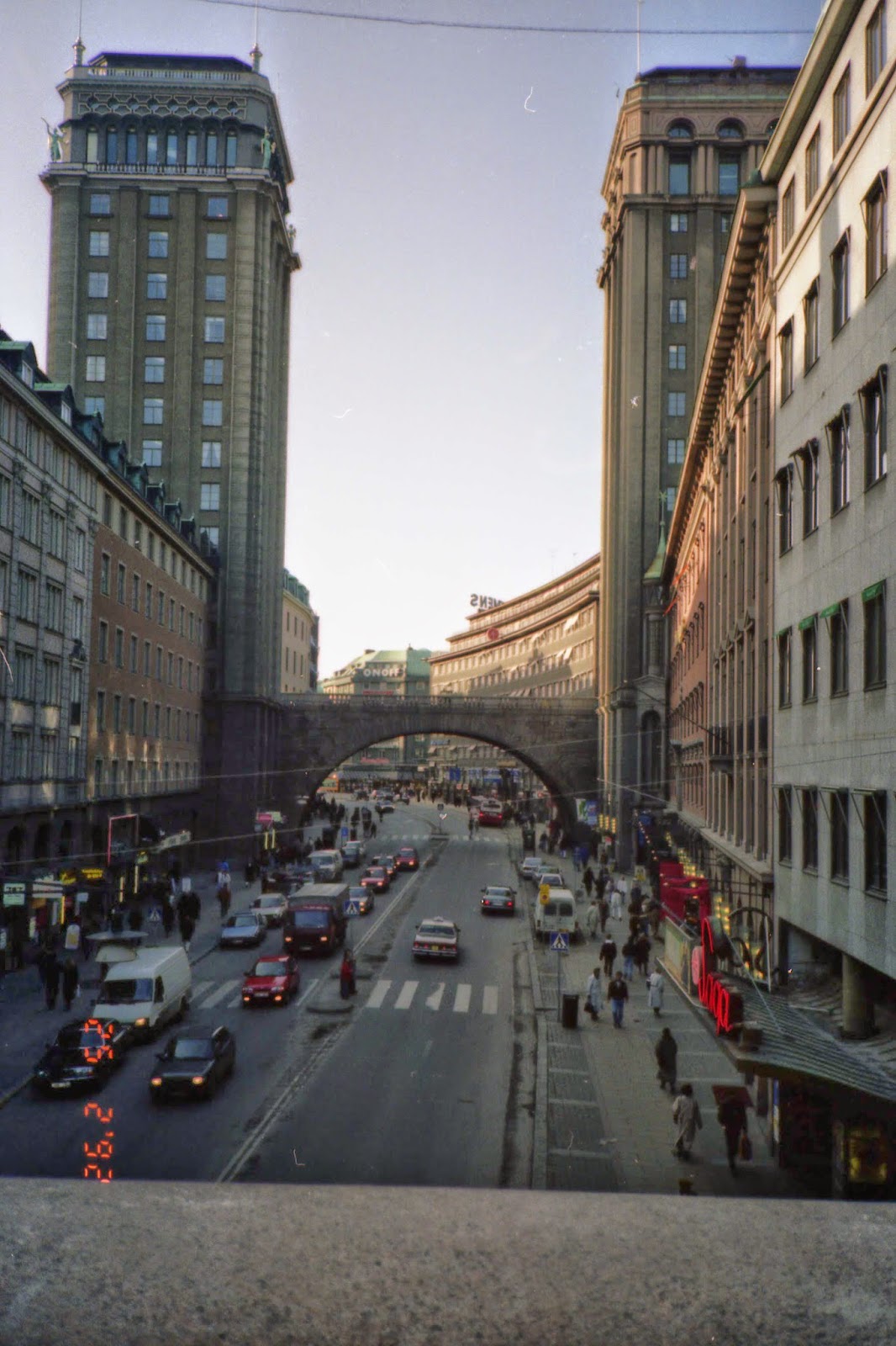 Regeringsgatan ja Kungsgatanin risteyksen sillalta otettukuva pitkin Kungsgatania. Kungstornet eli kaksoistornit selkeästi tunnistettavissa kuvasta.