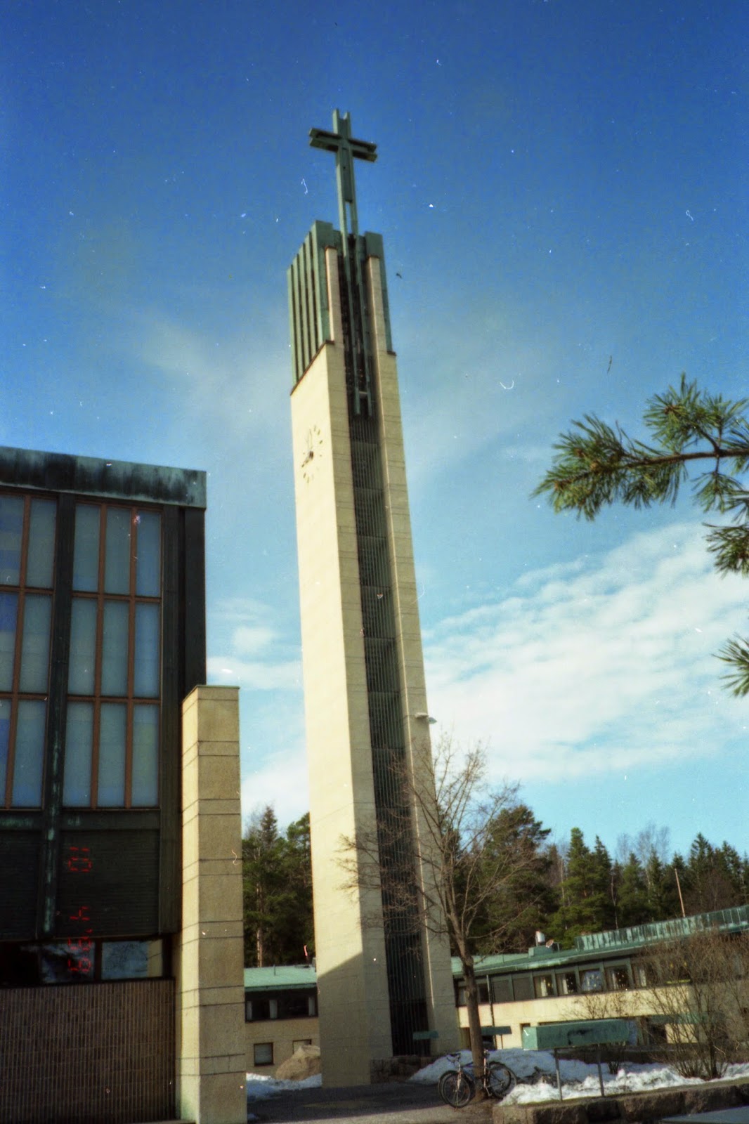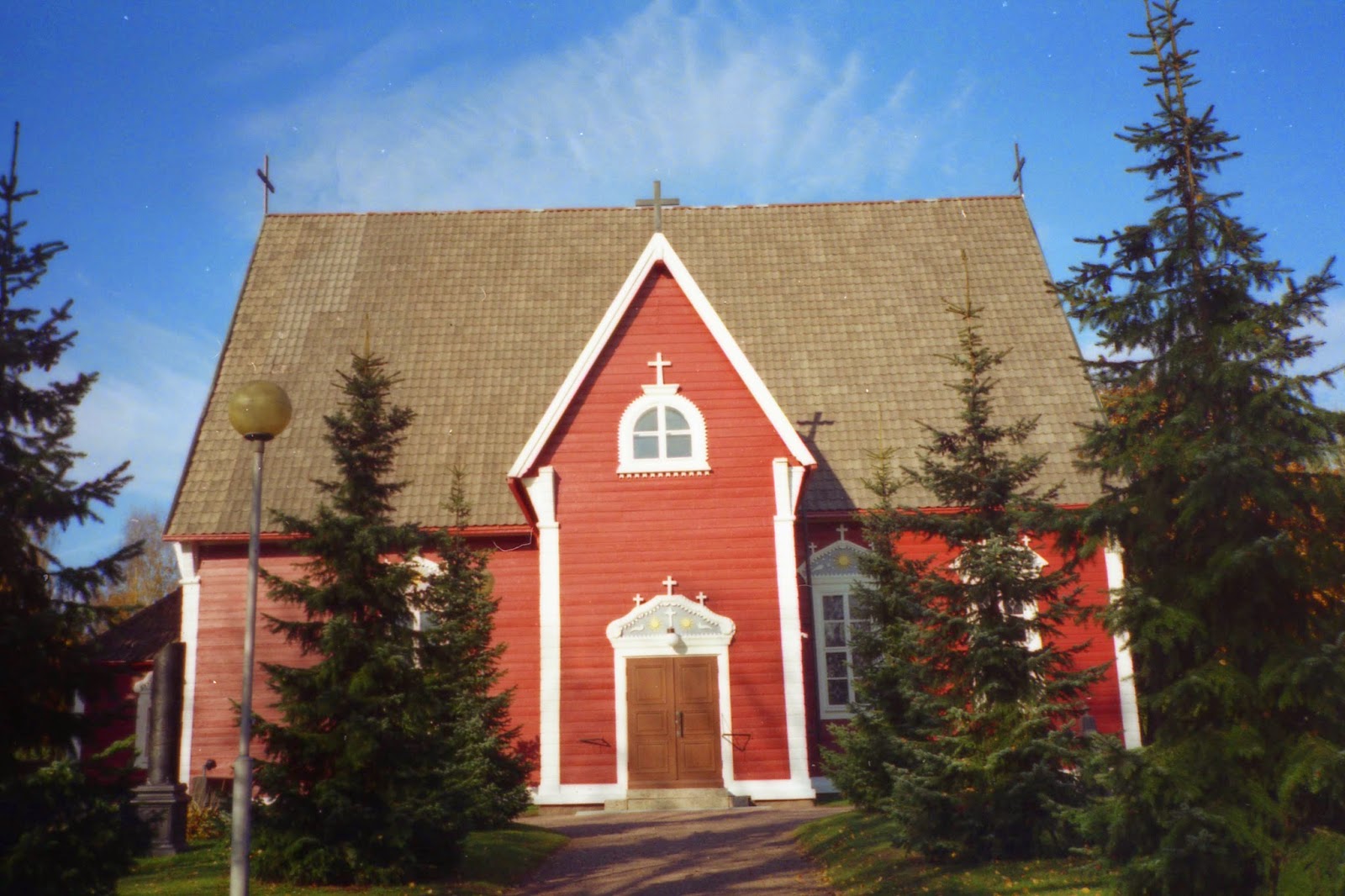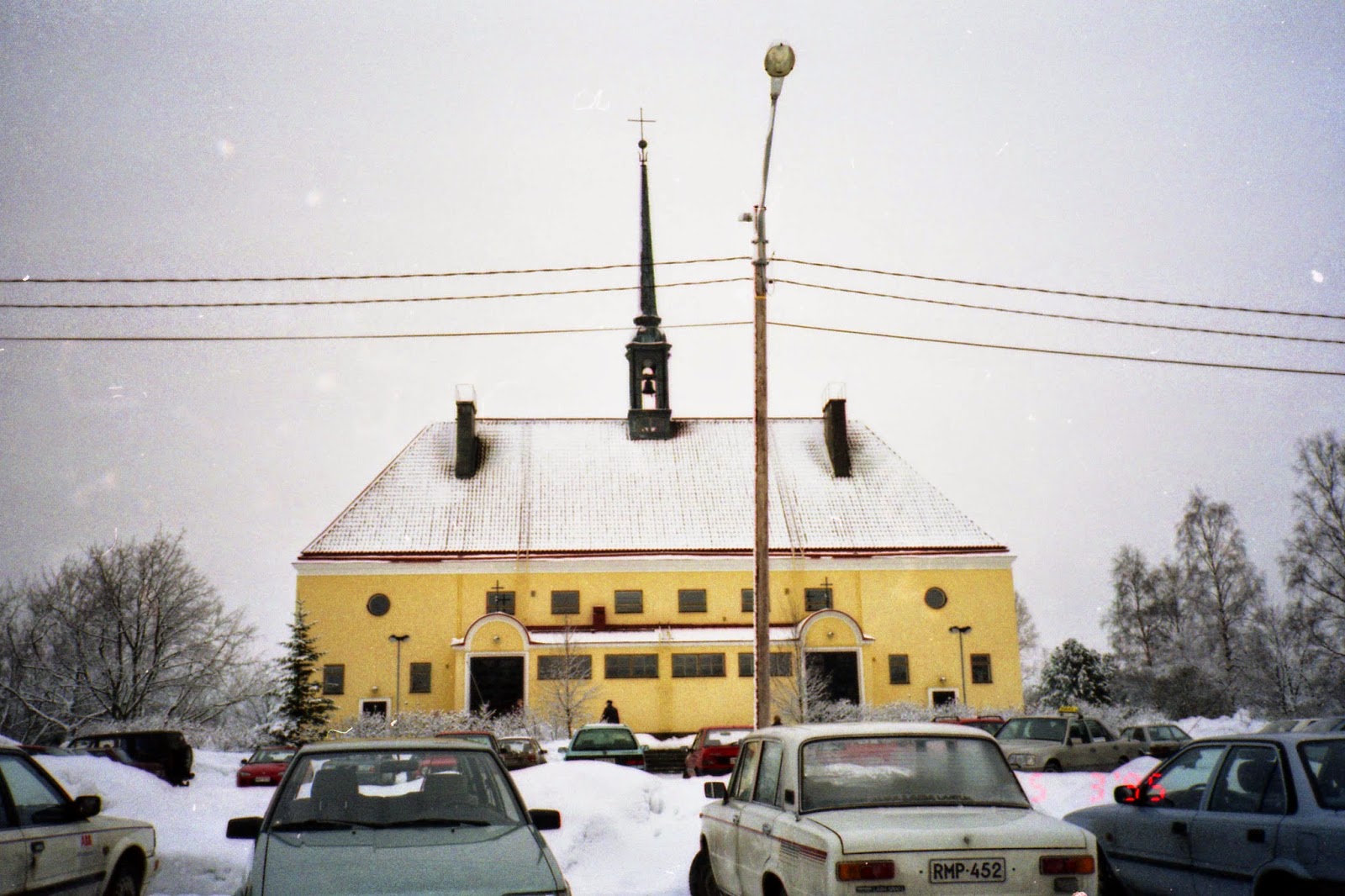 Imatran Tainionkosken kirkko ulkoa v. 1995. Serkun ripiltä pääsy. Vanha filmikamera käytössä.