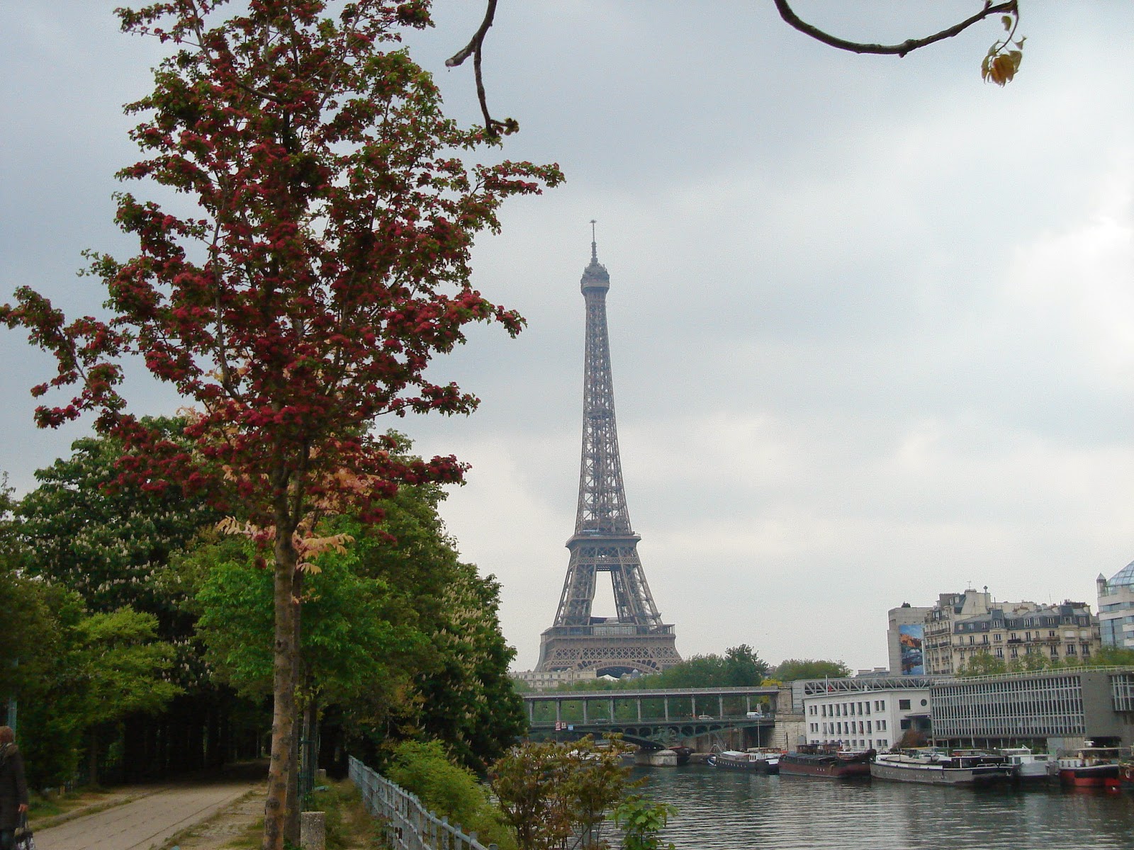Kirsikkapuut kukkii Palais de Chaillotin puistossa Seinen rannassa vastapäätä Eiffel tornia. Seuraavassa kuvassa samaa puisto aluetta Eiffelin suuntaan.